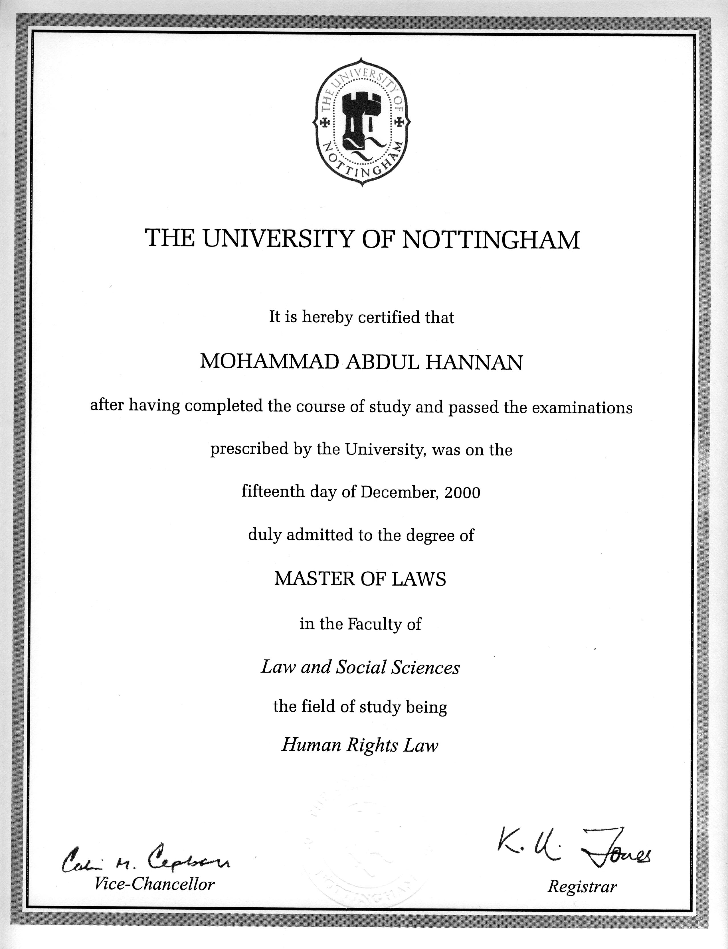 LLM (Nottingham) Certificate